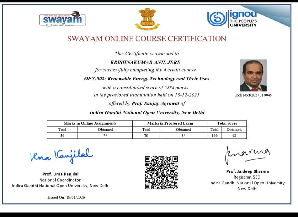 NPTEL SWAYAM Certification – Renewable Energy Technologies