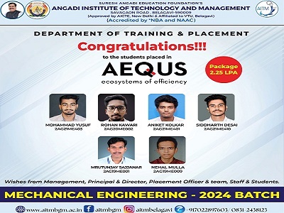 Gallery Graduation Day 2025 Placement Day 2025 Students from various department and colleges participated in “Vencer 2025” The Department of Mechanical Engineering at AITM successfully organized a Parents Meet on 26th April 2025 at the AITM Seminar Hall A distinguished guest lecture was organized on 27 March 2025 by the Department of Mechanical Engineering “Ingenious-2025” National level Technical Project Exhibition organized on 28th February 2025 Mechanical Engineering students placed in AEQUS Aerospace Company in the year 2023-2024 7th Semester Mechanical Engineering students completed AICTE Activity points in Govt. Higher Primary School Kanabaragi on 1st December 2022 Belagavi Department of Mechanical Engineering conducted a Parents Meets on 12th December 2022 at AITM Belagavi “Mechstreak Inauguration”on 11th November 2021 “Mechstreak Inauguration”on 11th November 2021 Webinar on Industrial IoT on 25th June 2020 Online Alumni Meet on 11th July 2020 Parents meet on 24th May 2022 Parents meet on 24th May 2022 Fashion Show group winner in Vencer-2022 Fashion Show Vencer-2022